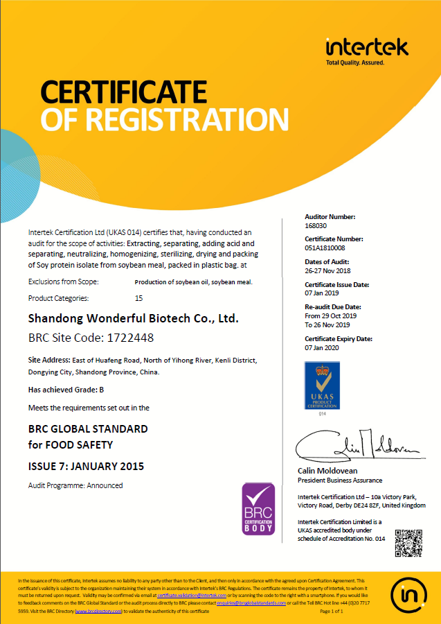 2019年1月7日,我公司大豆分離蛋白產(chǎn)品生產(chǎn)線通過(guò)了BRC全球食品技術(shù)標(biāo)準(zhǔn)(BRC Food Technical Standard)認(rèn)證。這代表我公司的分離蛋白產(chǎn)品的品質(zhì)和質(zhì)量安全管理已達(dá)到全球領(lǐng)先水平,取得了出口歐盟的通行證。